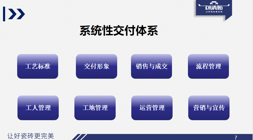 交付工艺分歧一,但实正把交付系统往终端落实的很少,仅目前铺贴费用就跨越130万,底子卖不动货。大多仅能承担卖砖的根本职责。好比当前奉行的精工半包模式,打动客户的环节不正在于上一辈人,